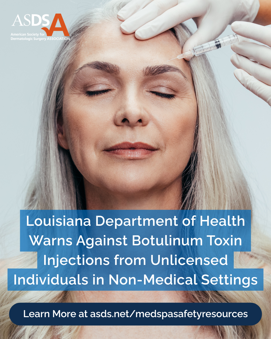 The Louisiana Department of Public Health reminds the public to only receive FDA-approved botulinum toxin injections by a licensed individual in a healthcare setting after two reports of botulism-like symptoms. ASDSA encourages patients to ensure medical procedures are performed or supervised by an onsite physician using FDA-approved products, especially by a board certified dermatologist.