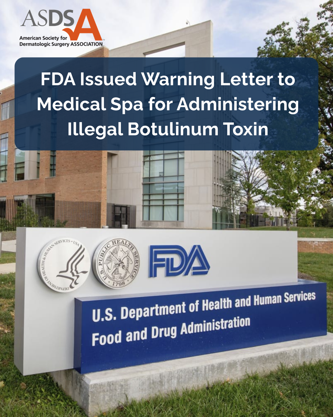 The FDA has sent warning letters to 18 websites for illegally marketing and selling counterfeit or unapproved versions of botulinum toxin and similar injectable products following reports of adverse events associated with the products. ASDSA encourages patients to ensure medical procedures use FDA-approved products and are performed or supervised by an onsite physician, especially by a board certified dermatologist.