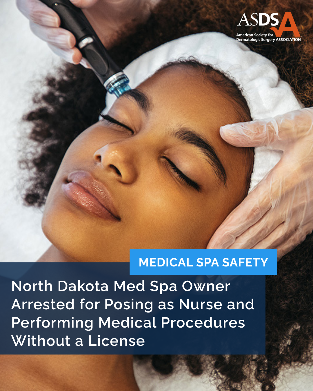 A North Dakota med spa owner was arrested for allegedly representing herself as a registered nurse and performing medical procedures without a license. She reportedly used a staff member’s medical license to schedule patients, prescribe medications, and perform procedures. ASDSA urges patients to ensure medical procedures are performed or supervised by an onsite physician, especially by a board certified dermatologist.