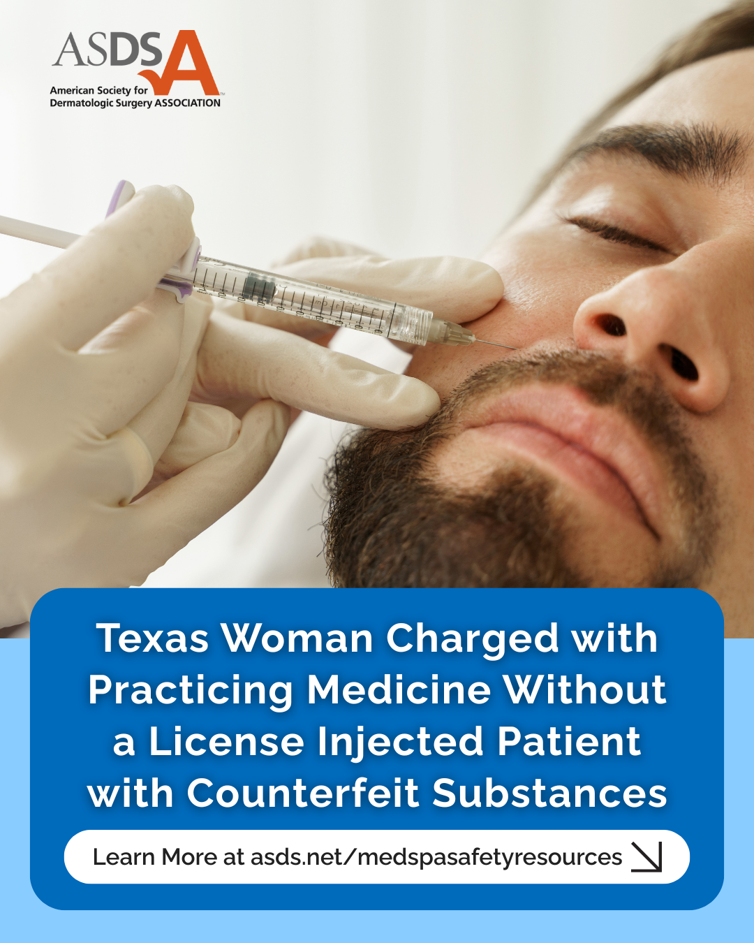A woman operating a Texas med spa was charged with practicing medicine without a license after she injected a patient with an unknown, counterfeit substance that resulted in serious complications. ASDSA encourages patients to ensure medical procedures use FDA-approved products and are performed or supervised by an onsite physician, especially by a board certified dermatologist.