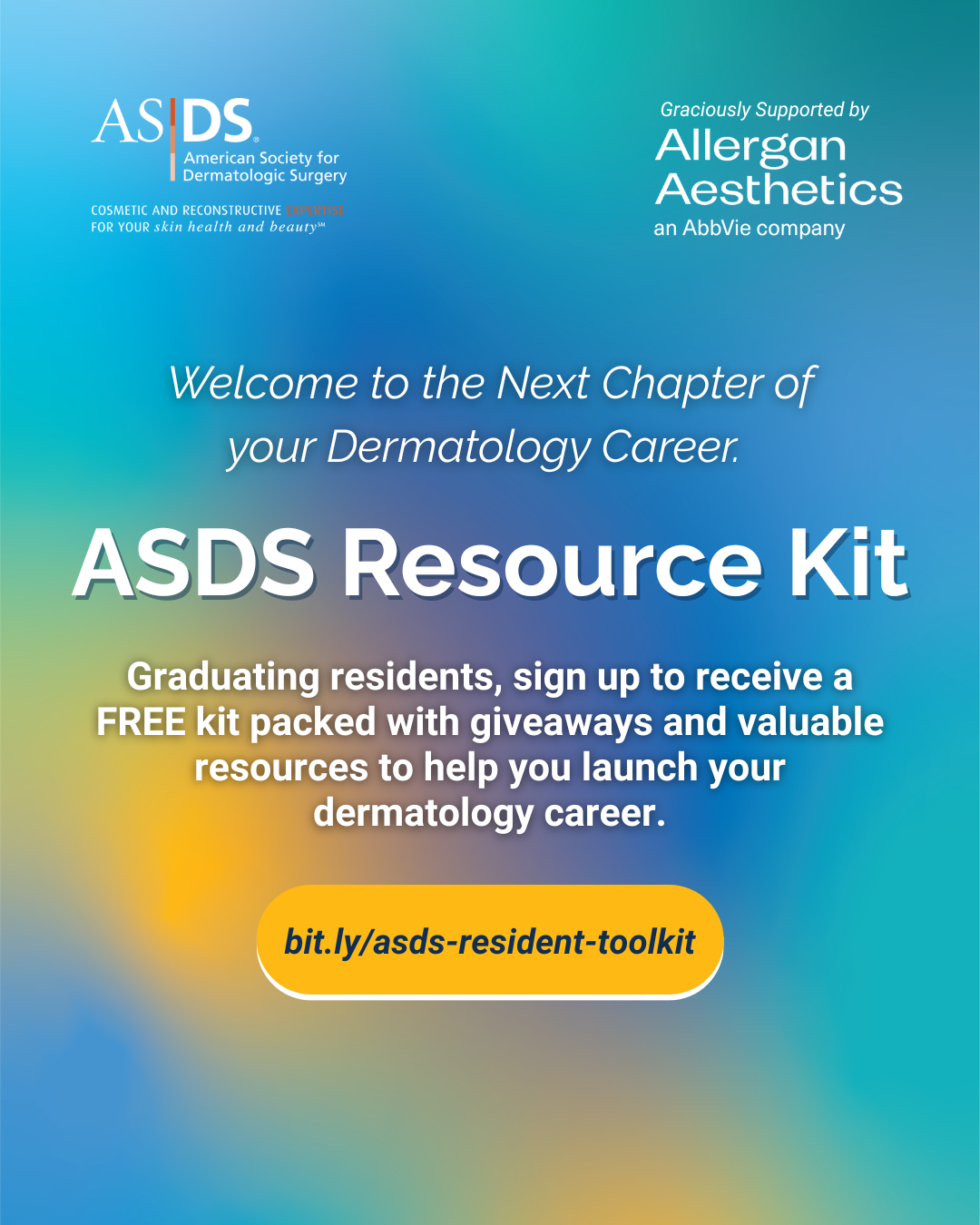 Are you graduating residency this year? Sign up to receive the complimentary ASDS Resource Kit for the New Dermatologic Surgeon — graciously supported by Allergan Aesthetics, an AbbVie Company.